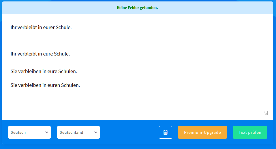 Mir ist aufgefallen, dass es den LanguageTool egal, ob ich “eure” oder “eurer” einsetzte, was auf einer fehlende Regel führt.