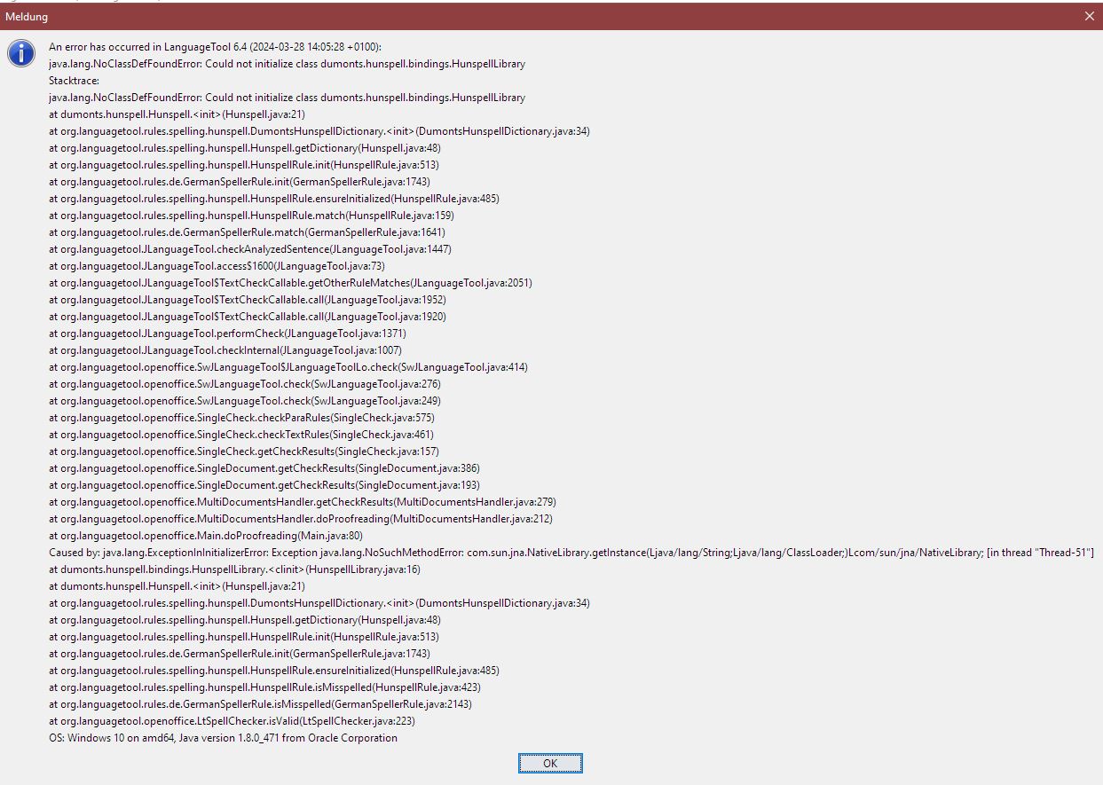 Every time I start LIbreOffice Writer an move my mouse cursor, I get his error window. I checked all settings, they are set accordingly to the steps provided on the LT website. After clicking OK i have some time left to write my text and after a while or when doing copy & paste of text, thi error window opens again. It is quite frustrating having a premium account as a student who has to write many essays and papers and who requires LT on a daily basis, that does not work properly. Has any one a step by step procedure on how to get rid of these messages and solve the problem?